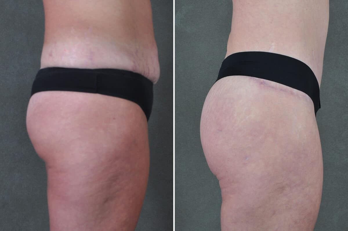 Check out these post-operative photos of a 42-year-old patient who underwent a mommy makeover with a combination of procedures that included breast augmentation with a lift, a circumferential tummy tuck, and liposuction of the thigh and hip area. The transformation is amazing and her post-operative photos were taken 8 months after her procedures.