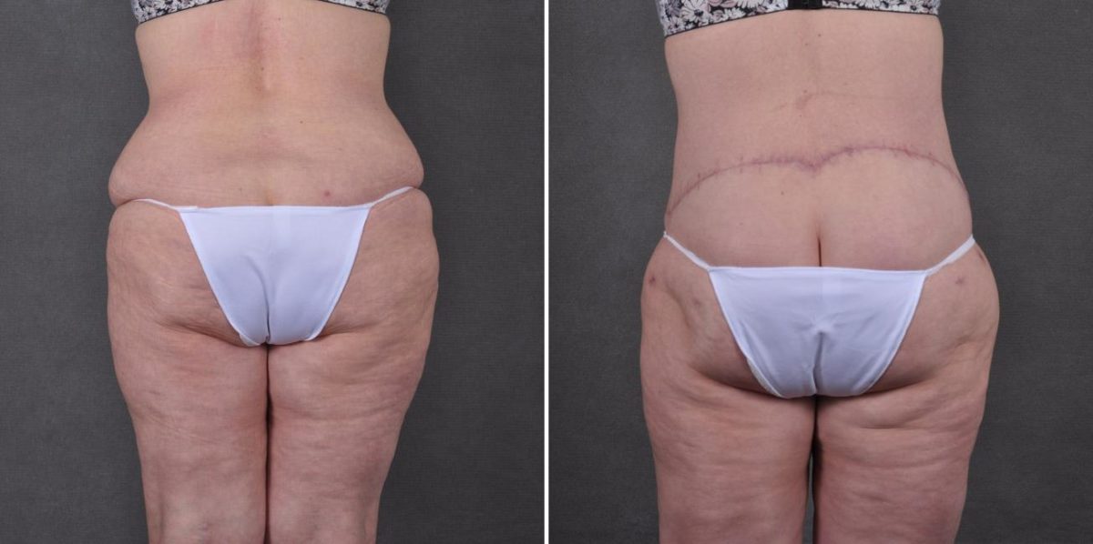 This 57 year old patient underwent a circumferential Tummy Tuck (circumferential abdominoplasty) and Liposuction of the hips and thighs. Her post-operative photos were taken just 3 months after her procedure.